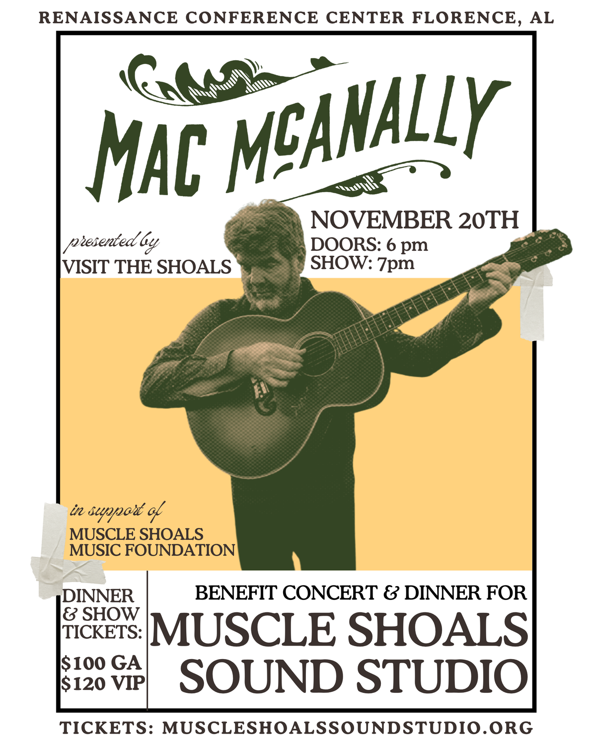 Join us for an unforgettable evening of music and dinner featuring the legendary Mac McAnally. All proceeds support the preservation of Muscle Shoals Sound Studio.